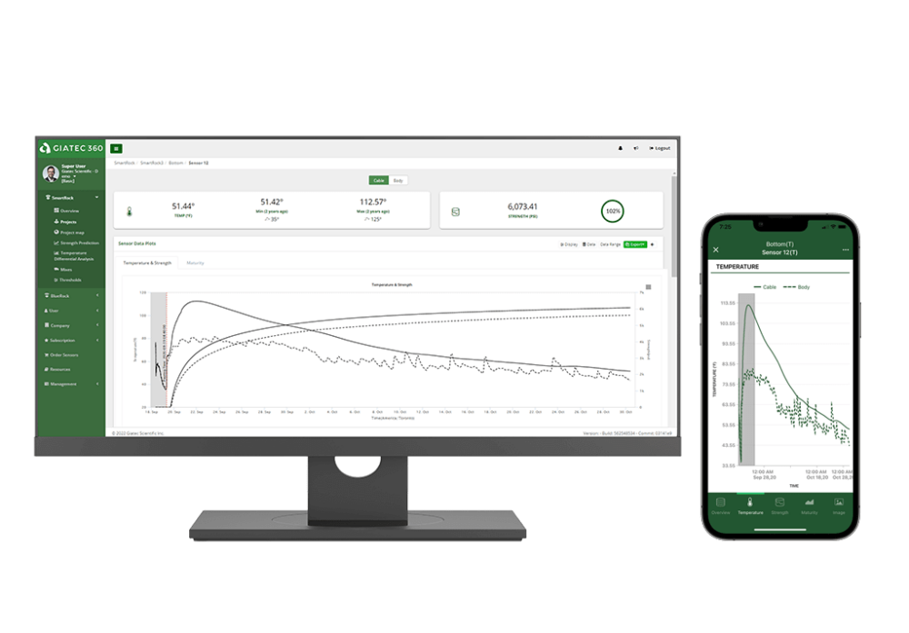 Abra la aplicación SmartRock para ver datos de temperatura y resistencia del hormigón en tiempo real o de forma remota mediante SmartHub.